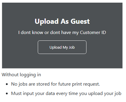 When uploading as a guest click on the "Upload my job" in the upload as a guest box. Be aware you will not be able to recall this print job in the future. You will not be able to retain your shipping/billing address in future uploads.
