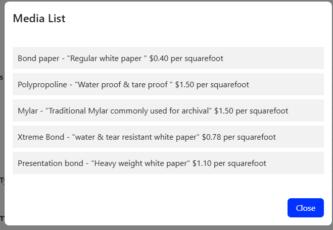 - Choose your media type by clicking on the pull down. You will be presented with a window showing the available types. Example shown below.