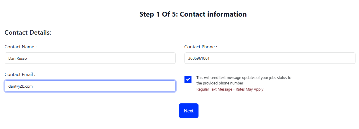 Now that you have selected Upload you will be directed to Step 1 of 5 in the upload process. Fill out the contact information and choose if you would like to receive text message alerts regarding your job by clicking in the box.
