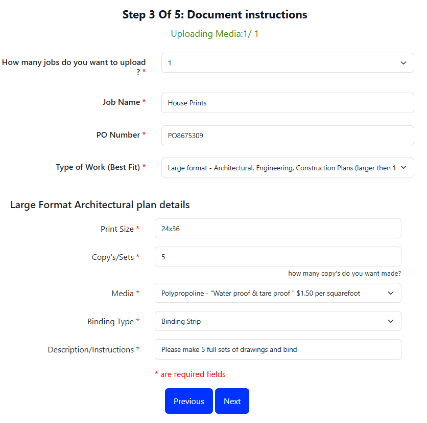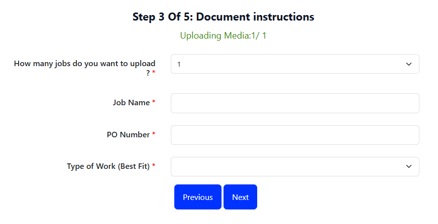 Choose how many jobs do you want to upload? If you choose to upload multiple jobs, you will have an opportunity to repeat steps 3 to 5 for each job. This is common for customers who may want to apply a different purchase order (PO) for different jobs. Enter your job name and PO number in the field below. If you do not have a PO you can substitute this for anything you would like such as the job name.