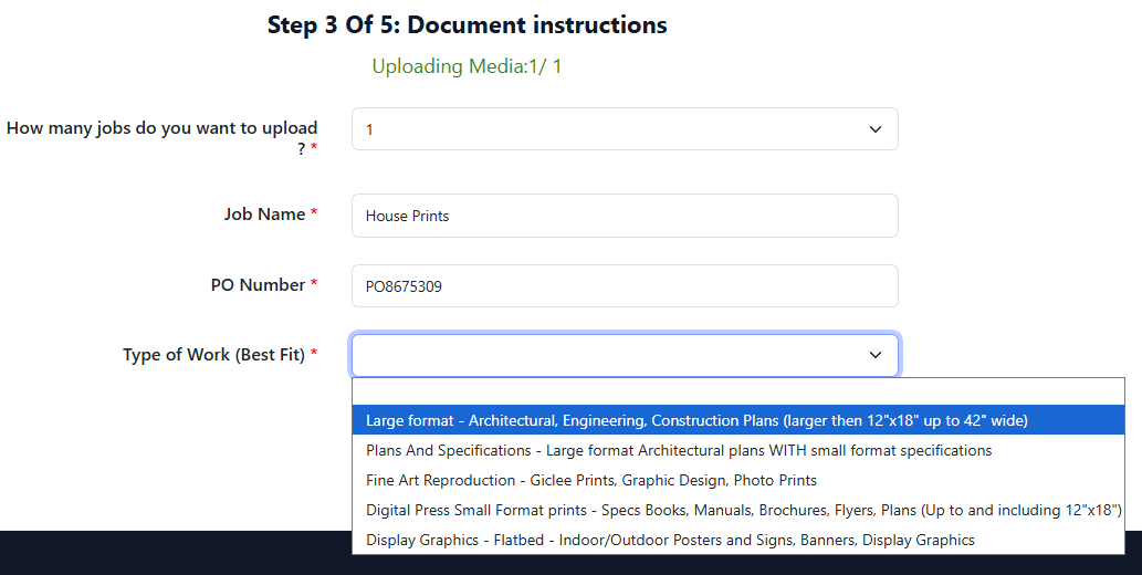 When you select a type of work, the required fields will appear in the window. Each type of work will have different questions required to submit your order. Below is an example of a large format document selections.