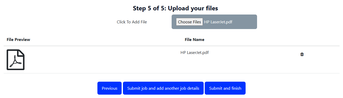 If in Step 3 you choose to upload more then 1 job you will have an additional button that allows you to submit your job and return to Step 3 and change your PO and choose a new set of files. Select "Submit job and add another job details" to return to step 3.