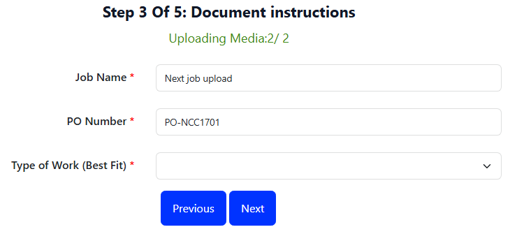 Multi job submissions will return you back to step 3 to start the next job upload. Note the "Uploading Media:2/2" on the screen showing you which job is currently being uploaded. Now repeat steps